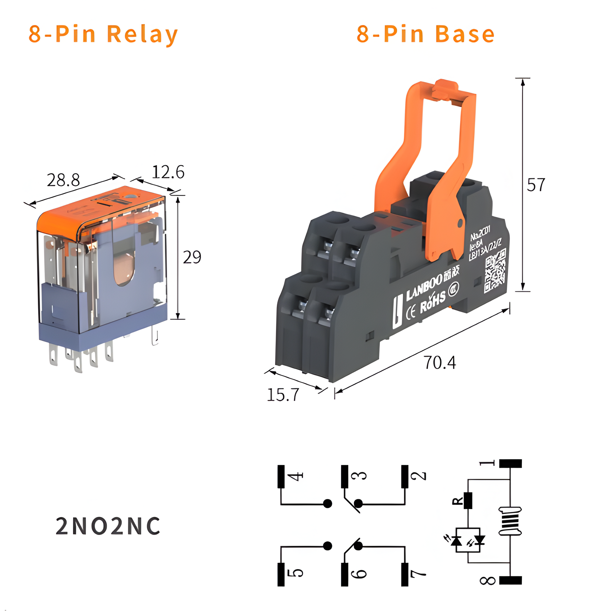 This compact and durable 12VDC 8A DPDT Relay is suitable for both standard rail and panel installation. With a contact capacity of 8A and 2NO2NC configuration with manual testing capabilities, it is ideal for controlling high-power equipment in industrial automation and power systems. It is also commonly used in elevator and lighting control systems.