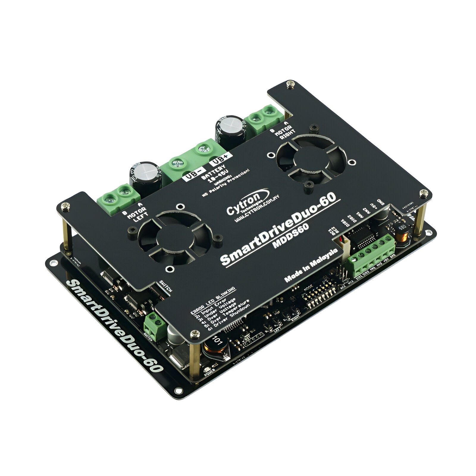 SmartDriveDuo60 has smart features of MDDS10, with higher continuous current capability, 60Amp each channel. It even has brushless fan attached on the top cover to cool it! MDDS60 is ready with the capability to accept RC (Radio Control) signal for mix mode drive, analog voltage from potentiometer, PWM from microcontroller (Arduino, PIC, or any other microcontroller), and even controlled via UART (serial) command. The operation modes is configure by the DIP switch on MDDS60. The commonly used configurations are printed on bottom cover. High current MOSFETs are switching at 16KHz for quiet operation. To cover the driver properly and to mount the fans for cooling, we have added top and bottom cover! Nice!