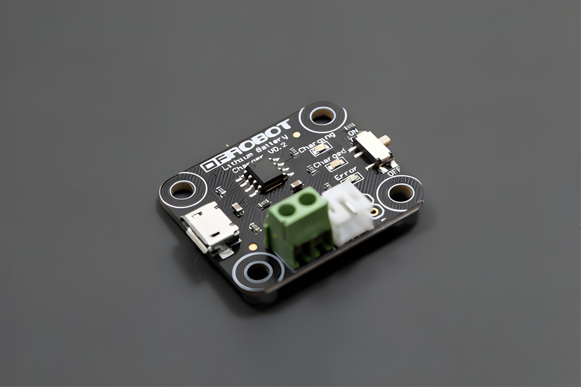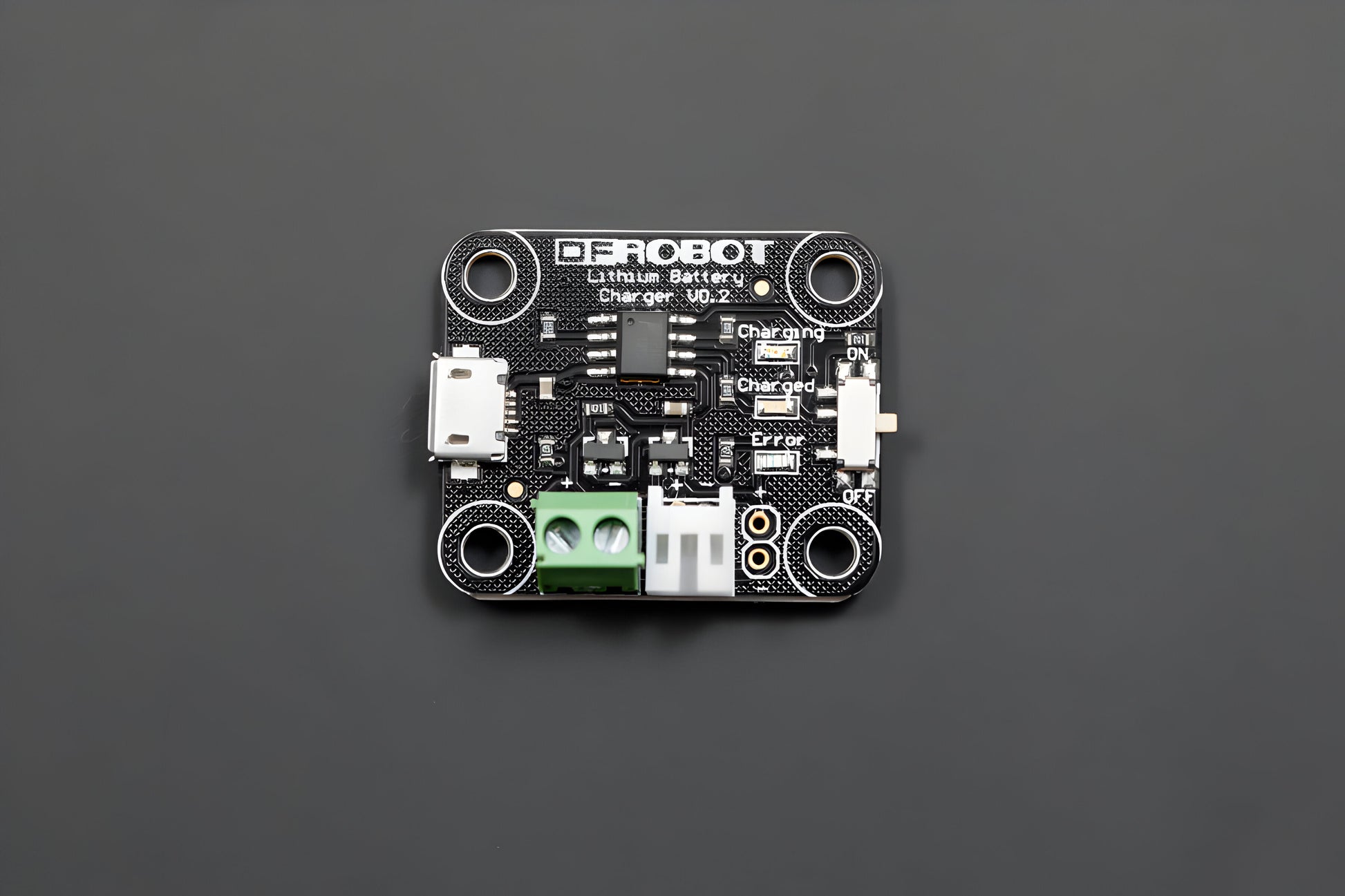 The board incorporates a charging circuit, status LED, connector for your battery (JST-type used in the batteries we carry), and a micro-USB connector. Four small mounting holes allows this charger to be easily embedded into a project.
