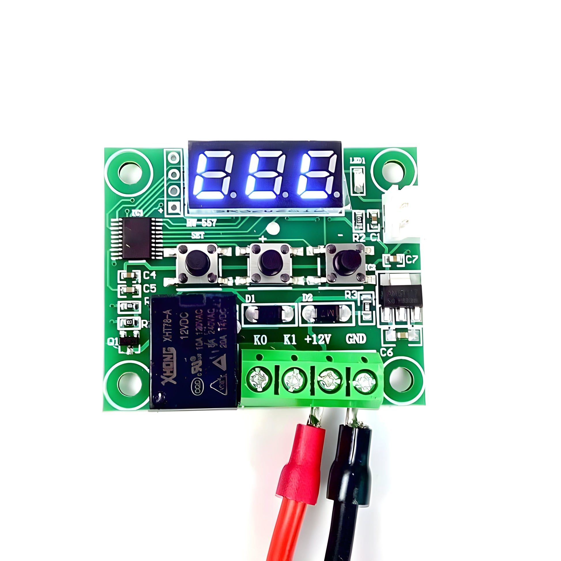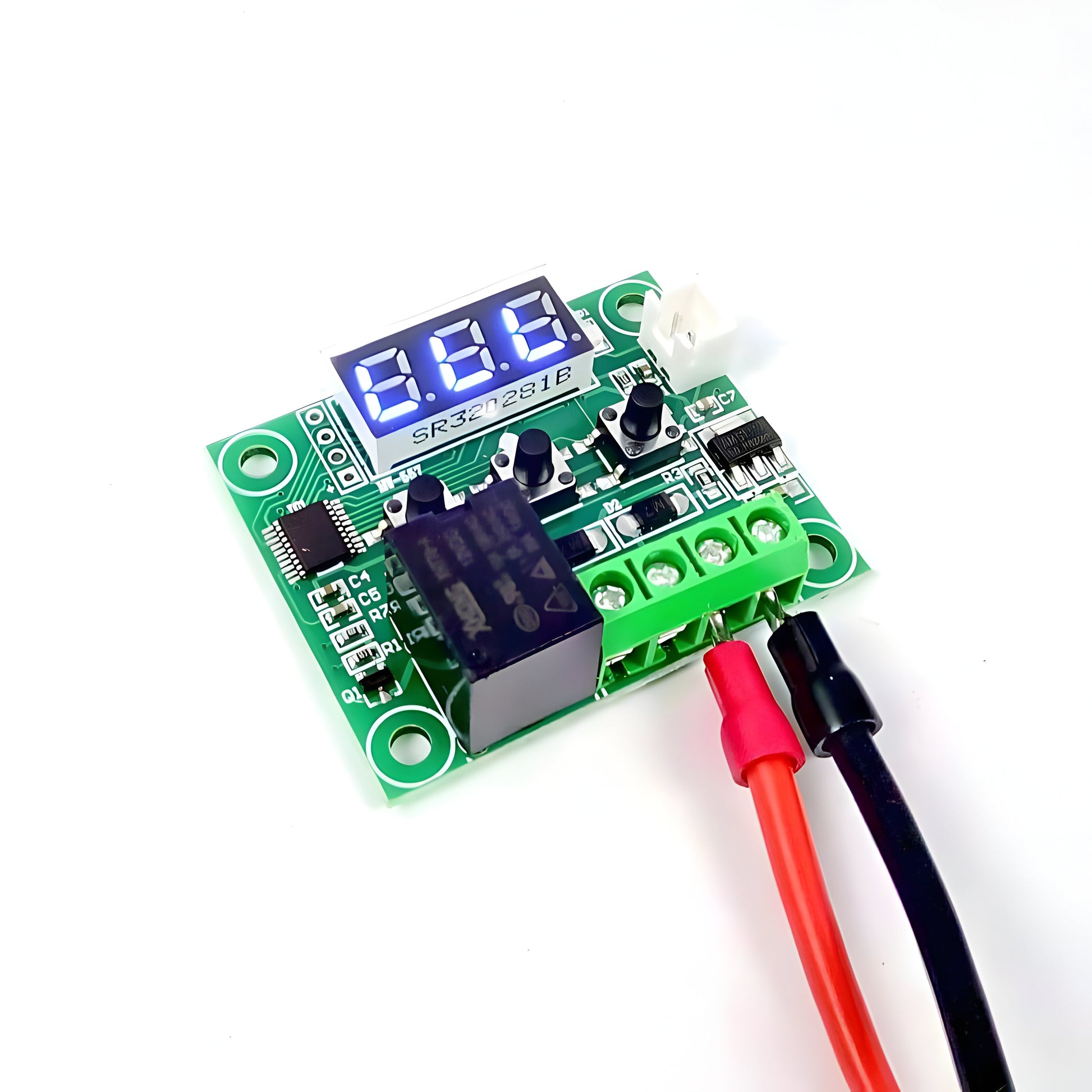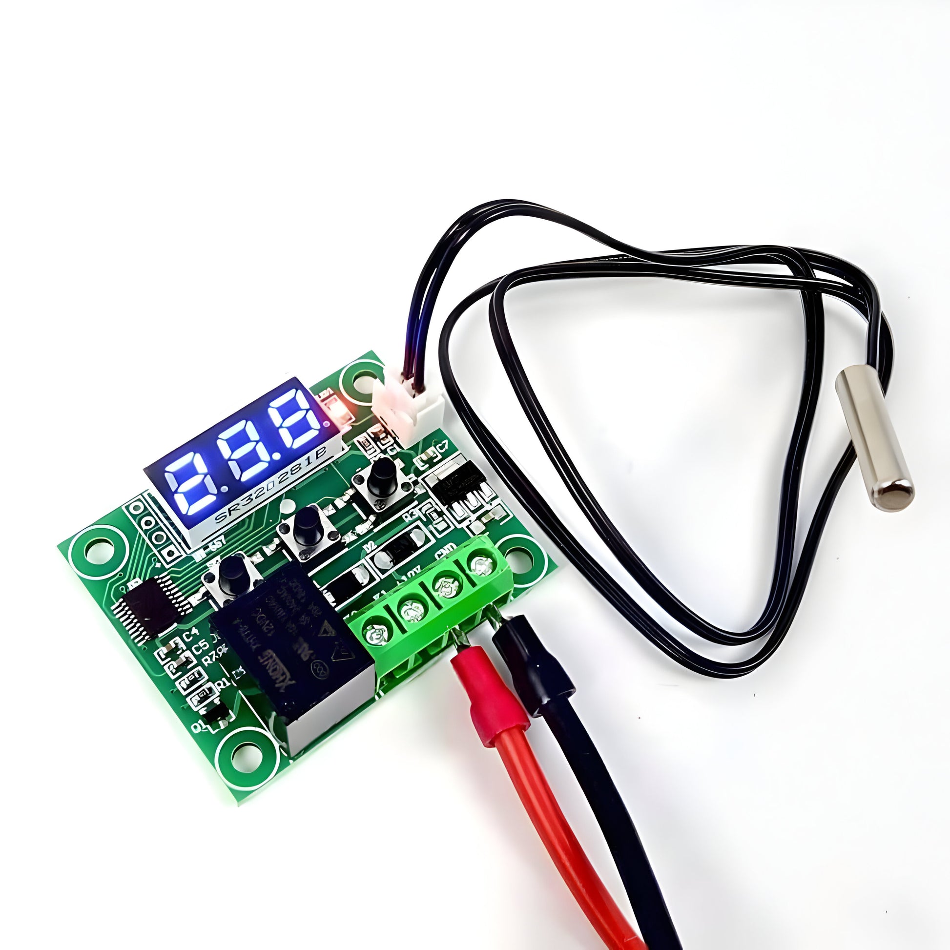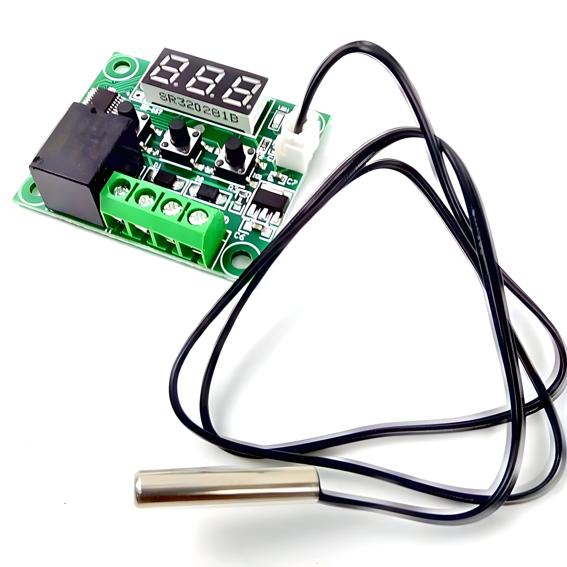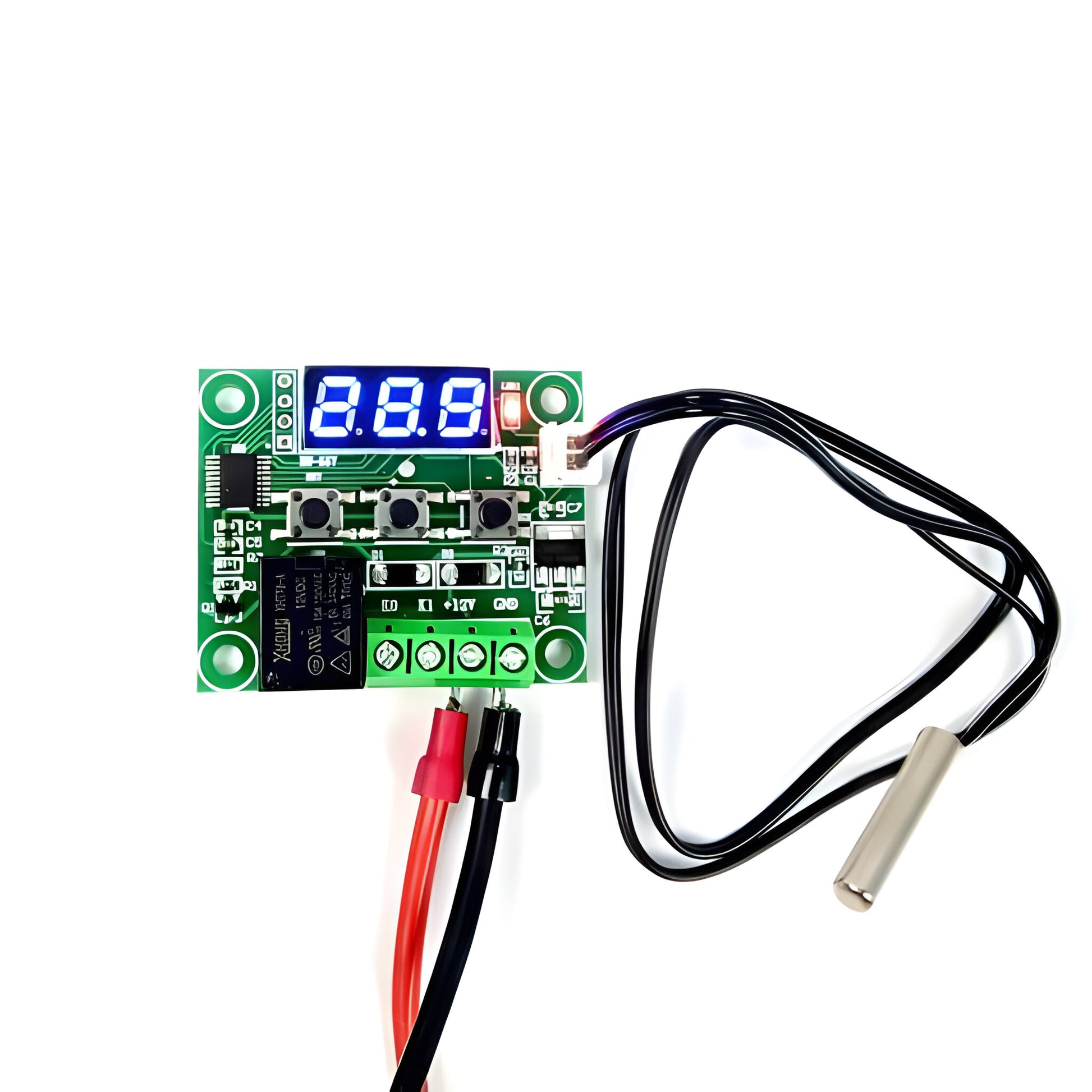 The W1209 is an incredibly low-cost yet highly functional thermostat controller. With this module, you can intelligently control power to most types of electrical devices based on the temperature sensed by the included high-accuracy NTC temperature sensor. Although this module has an embedded microcontroller no programming knowledge is required. 3 tactile switches allow for configuring various parameters including on & off trigger temperatures. The onboard relay can switch up to a maximum of 240V AC at 5A or 14V DC at 10A. The current temperature is displayed in degrees Centigrade via its 3-digit seven-segment display and the current relay state by an onboard LED.
