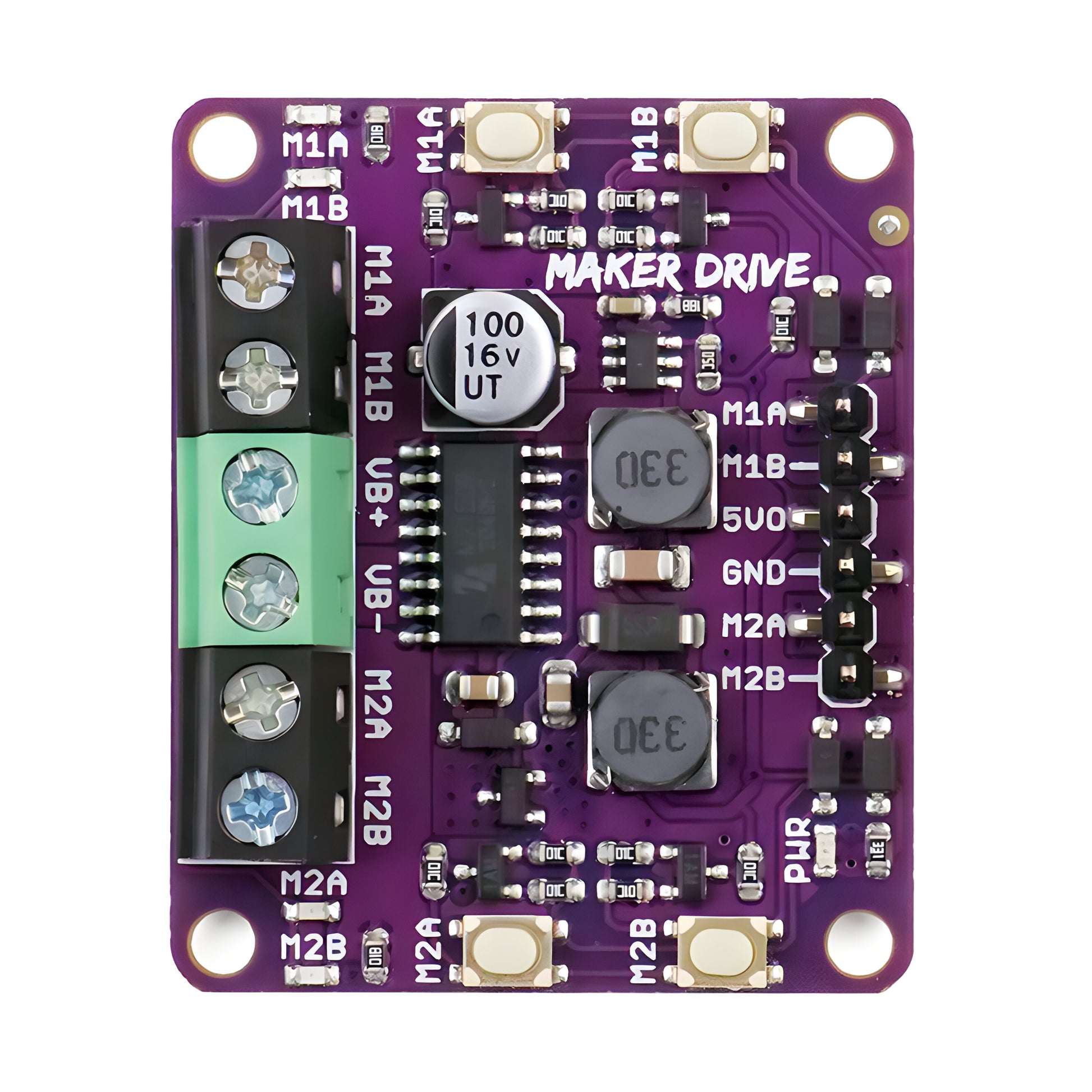 - 4 Indicator LEDs (2 for each channel) - Easily test your coding and wire connections. With these indicator LEDs, you can check the output voltage direction even without connecting to your motor. And combining with the Manual Test Buttons, you can test the Maker Drive easily even without controller and motor connected. You can also easily identify where the error occur for easy troubleshooting. Of course, no programming is needed too. These LEDs help in testing and troubleshooting.