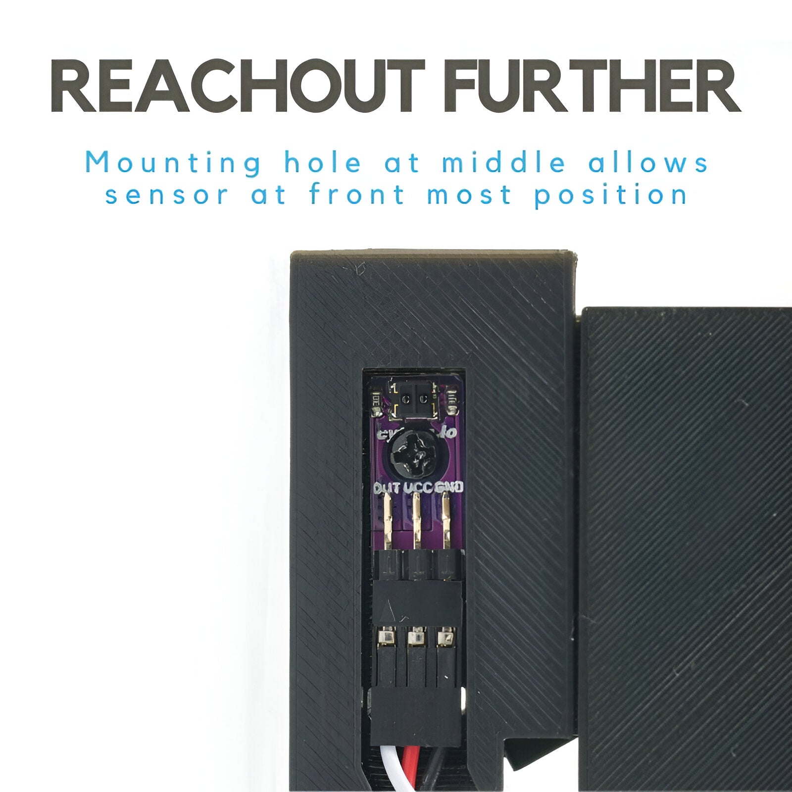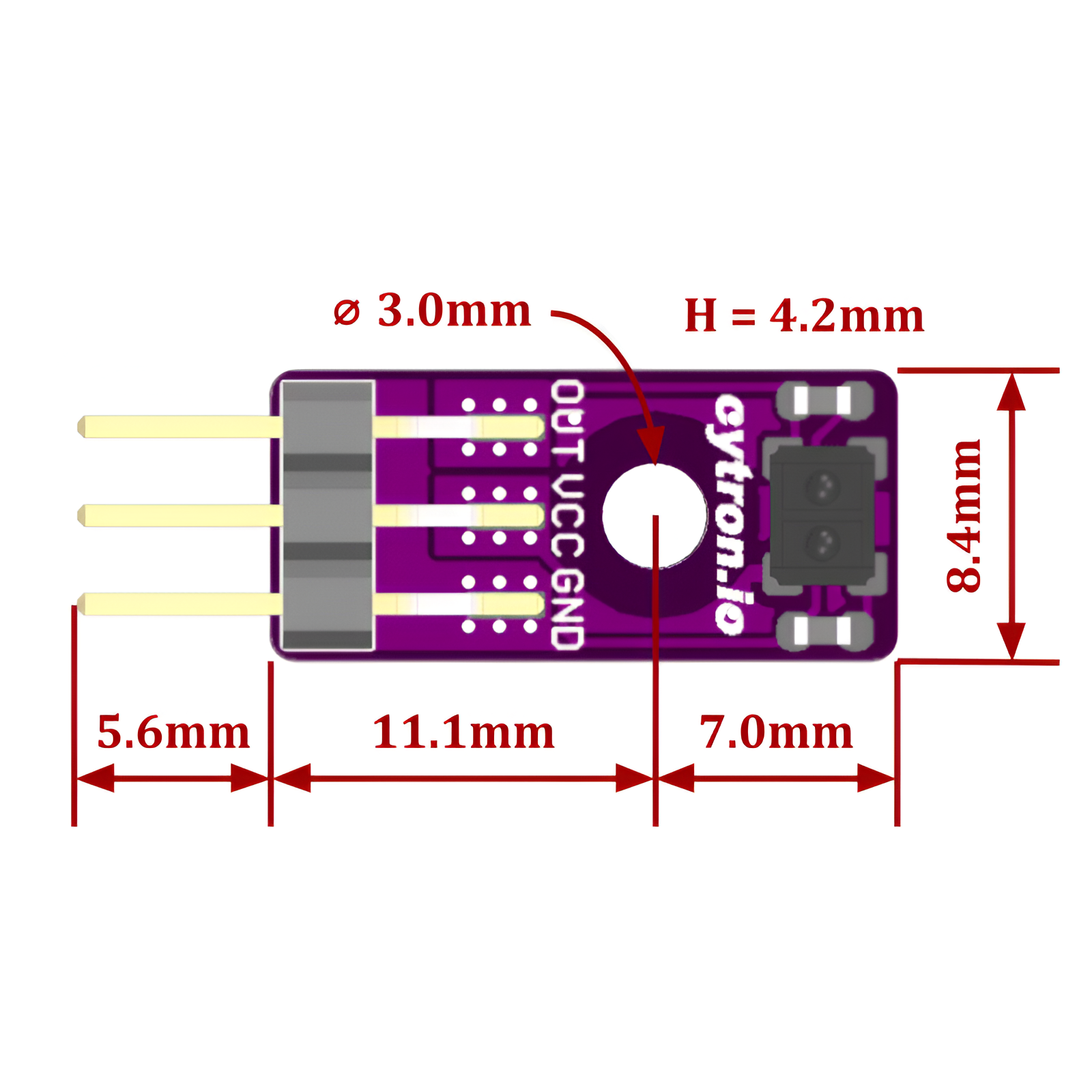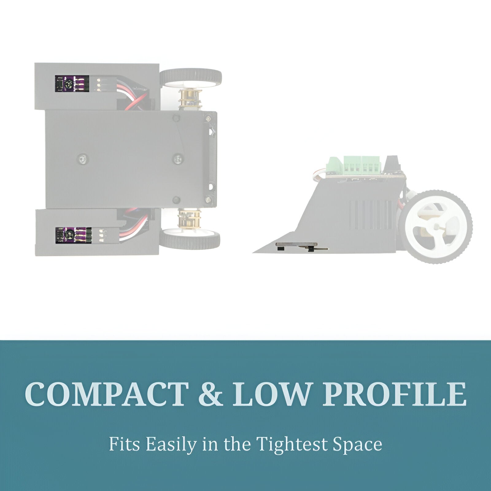 Measuring only (L)18.1mm x (W)8.4mm x (H)4.2mm (Exclude the header pin), this tiny sensor can be easily fitted in the tightest space available on your robot. We purposely designed the sensor so that the mounting hole is at the center so that the sensor can be at the front-most position. This is especially important in the Sumo robot.