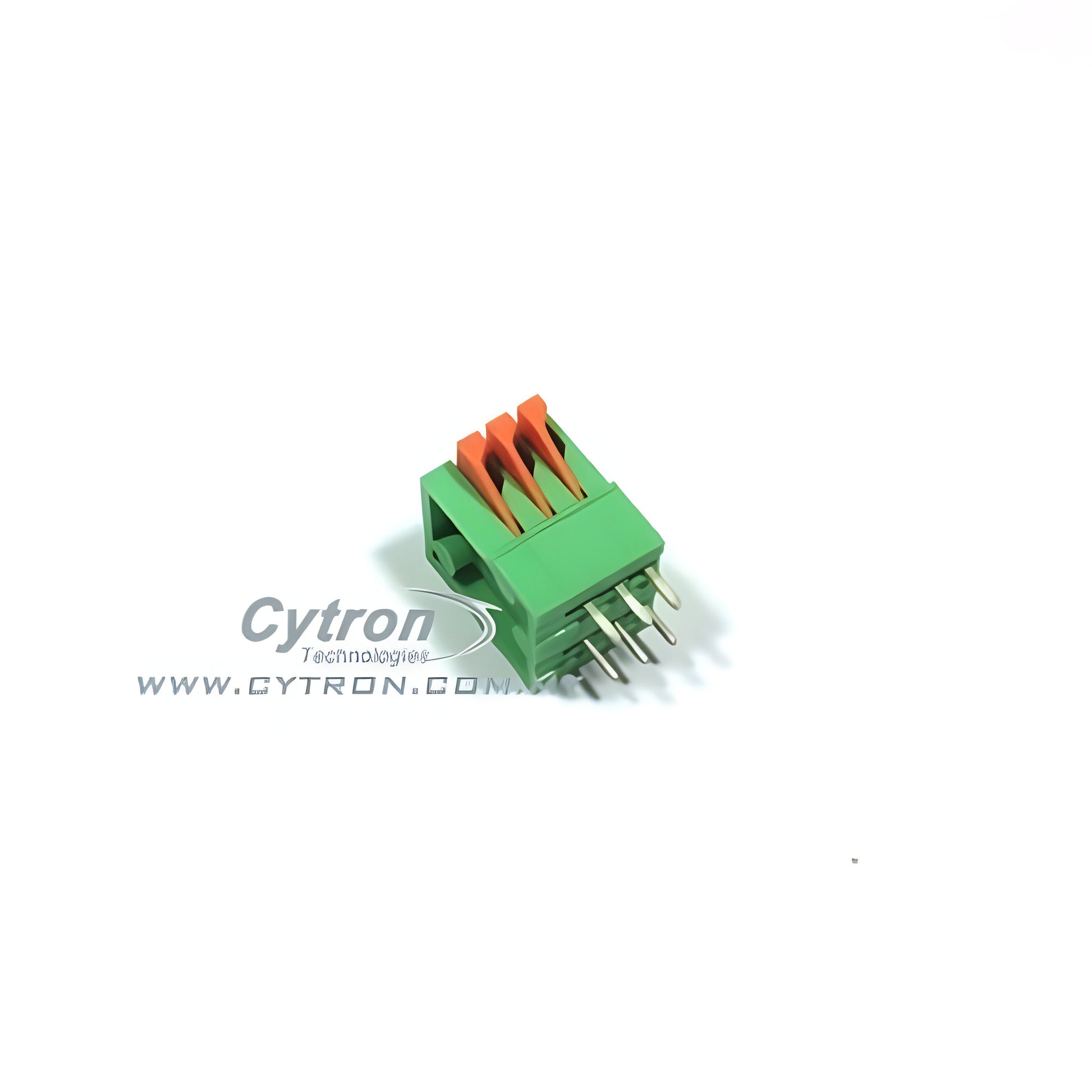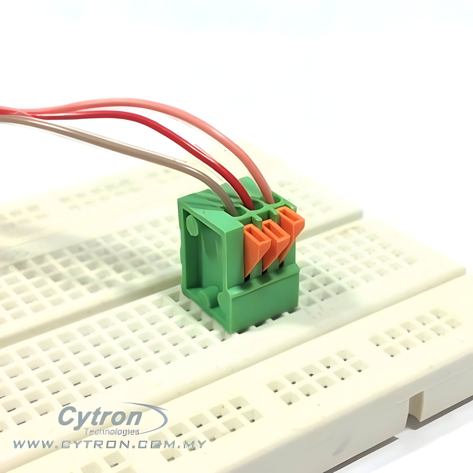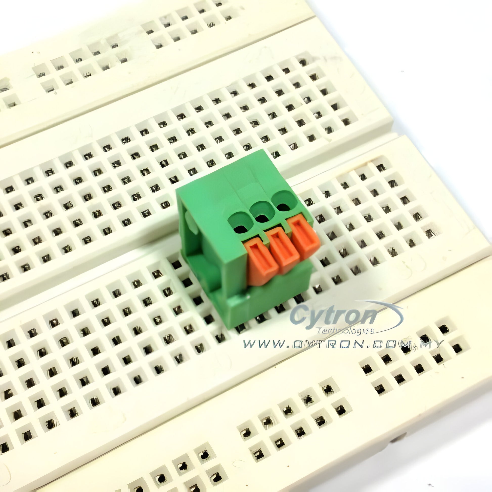 3 ways PCB mount spring terminals that enable quick connection that able to hold 16 to 20 AWG wires firmly in place. Standard pitch 0.1" (2.54mm) allowed to inserts directly on PCB or breadboard.