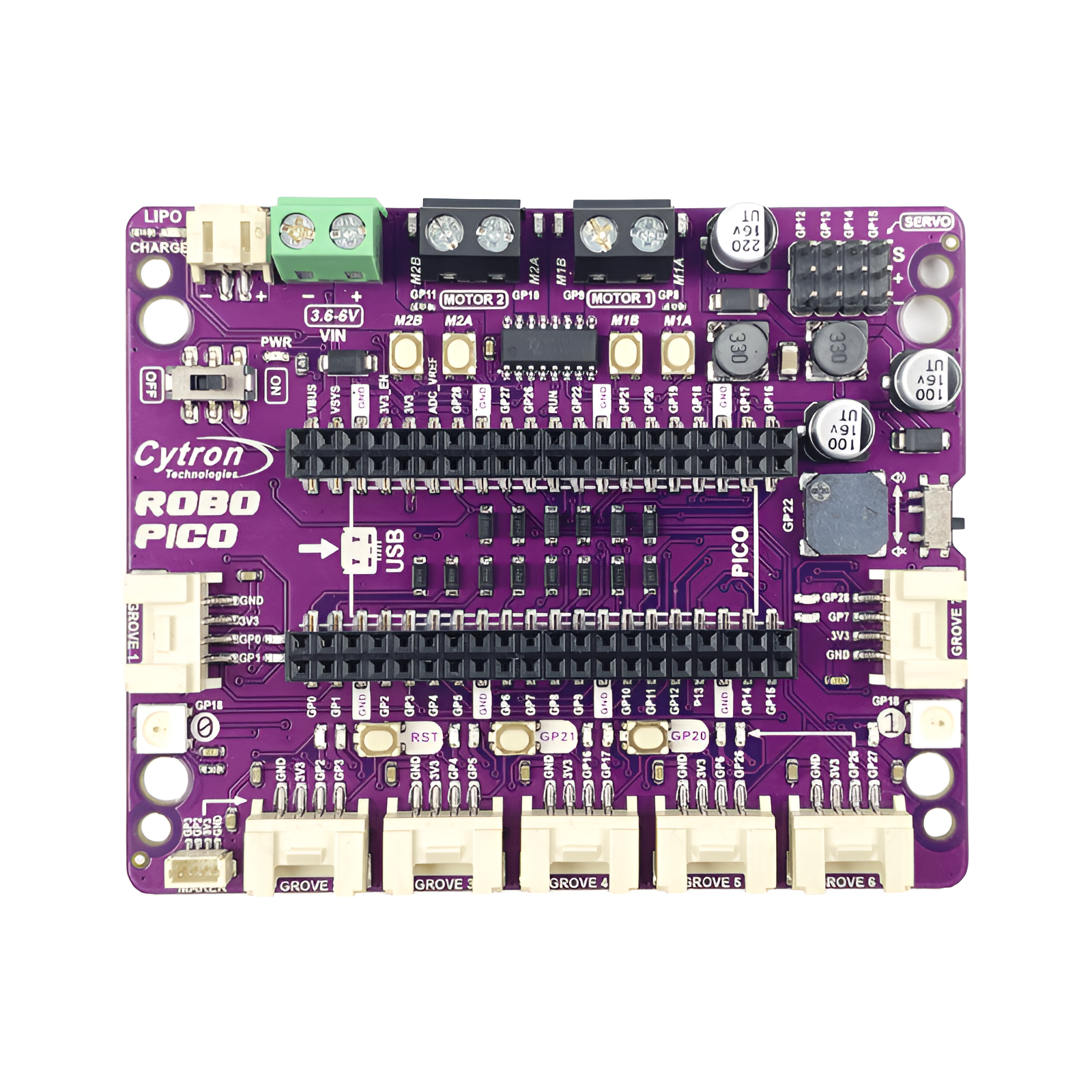 The Robo Pico is more than a board - it's a canvas for your creative masterpieces. Equipped with a dual channel DC motor driver, 4 servo motor ports, 7 Grove ports, a Maker port, two RGB LED NeoPixels, and a piezo buzzer, it's a playground of endless possibilities. Imagine the vibrant light displays you can design, the precise movements you can command, the unique sounds you can generate, and the innovative Internet of Things (IoT) projects you could create!