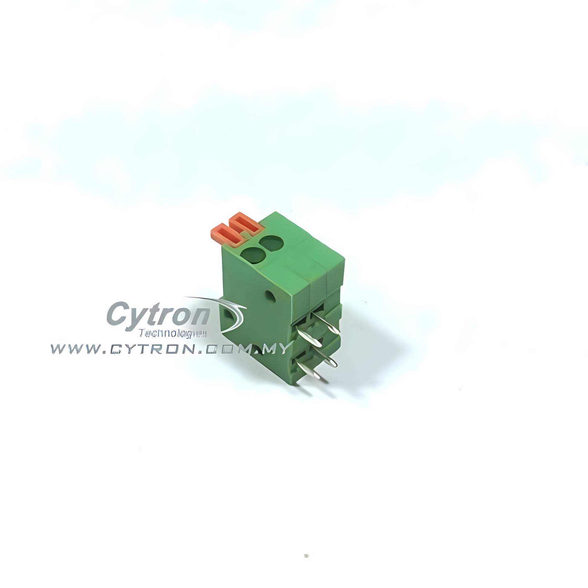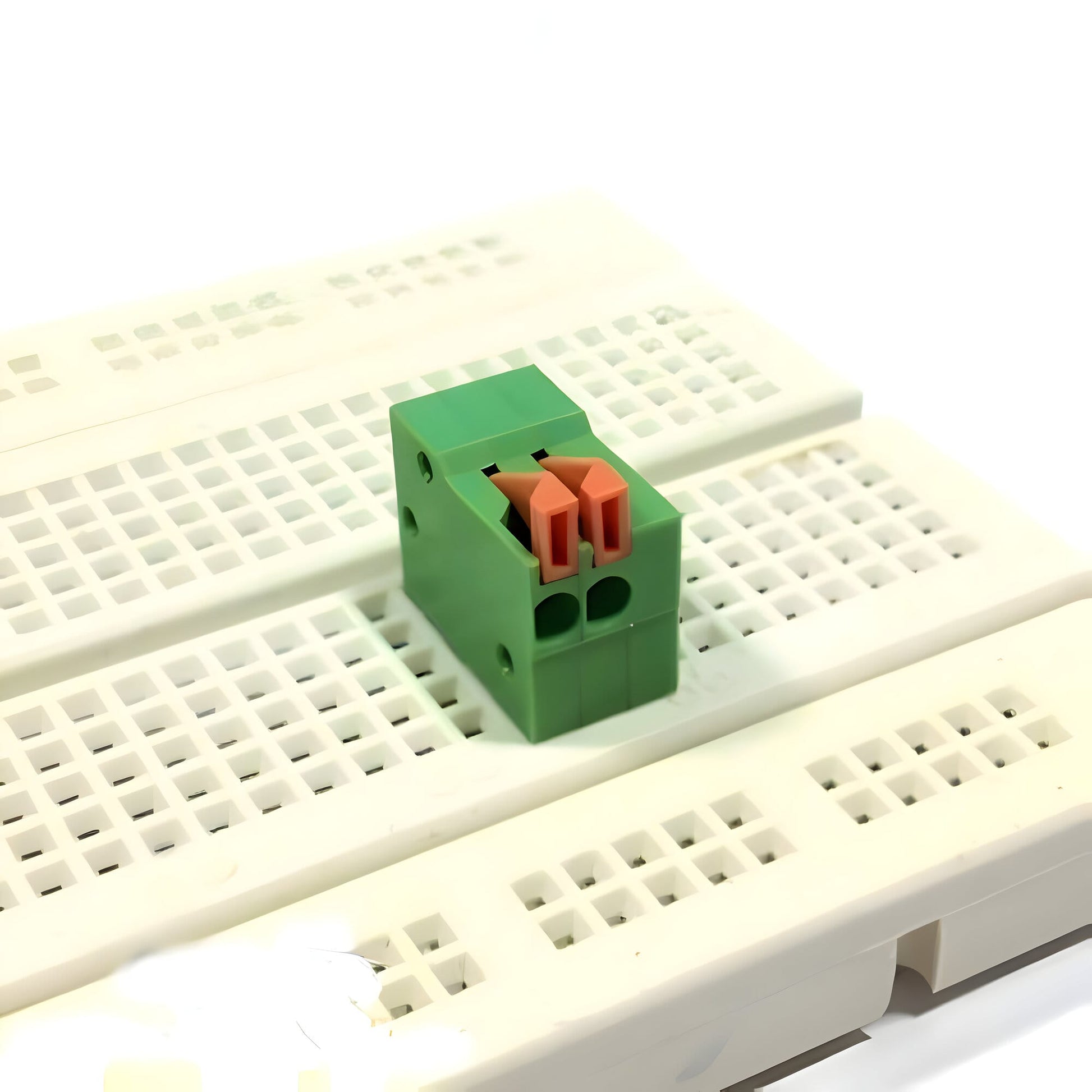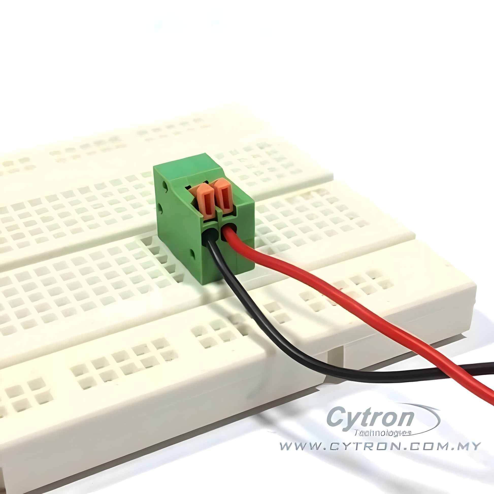 2 ways PCB mount spring terminals that enable quick connection that able to hold 16 to 20 AWG wires firmly in place. Standard pitch 0.1" (2.54mm) allowed to inserts directly on PCB or breadboard.