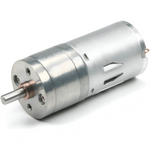 This gearmotor consists of a high-power, 12 V brushed DC motor combined with a metal spur gearbox. The gearmotor is cylindrical, with a diameter just under 25 mm, and the D-shaped output shaft is 4 mm in diameter and extends 12.5 mm from the face plate of the gearbox.