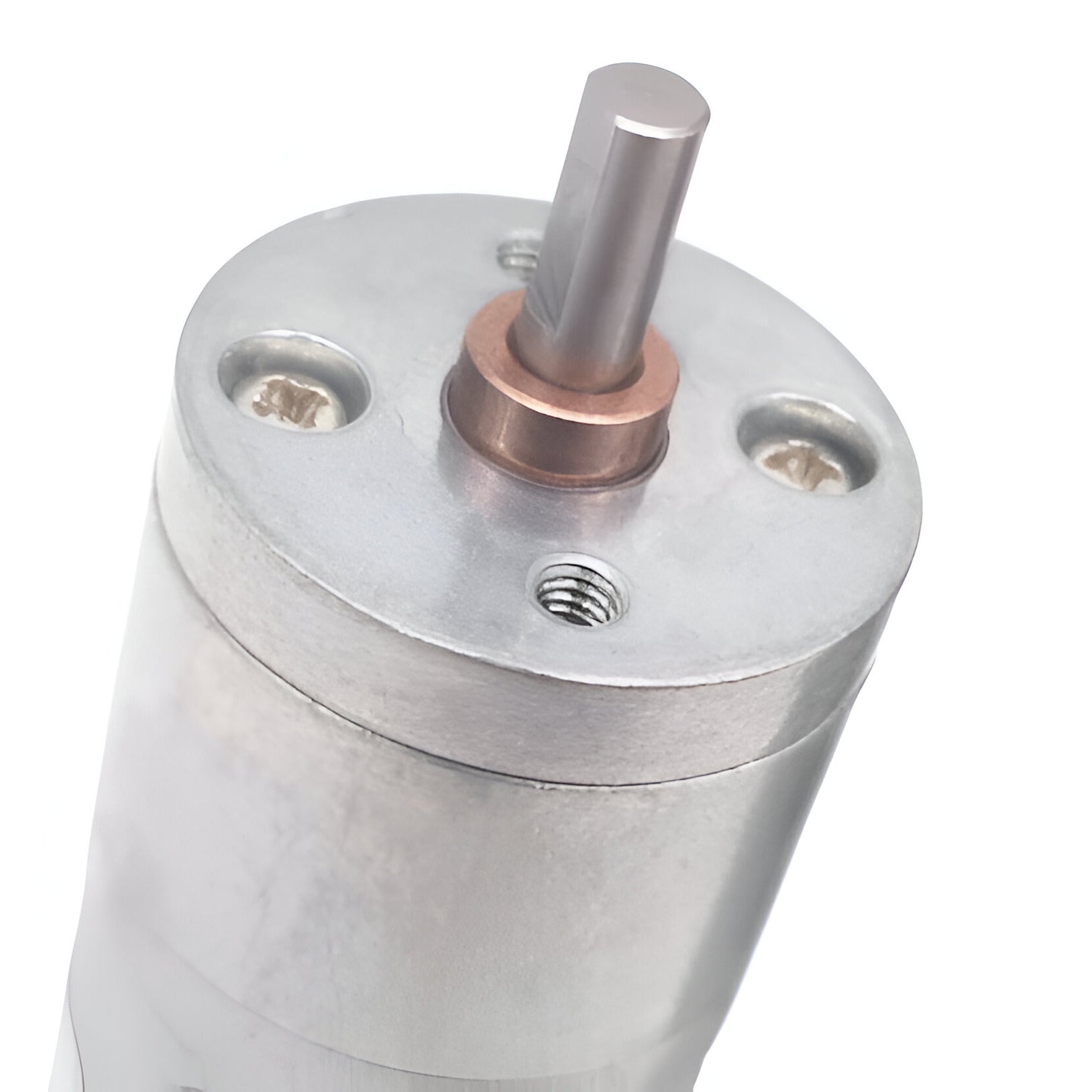 This gearmotor consists of a high-power, 12 V brushed DC motor combined with a metal spur gearbox. The gearmotor is cylindrical, with a diameter just under 25 mm, and the D-shaped output shaft is 4 mm in diameter and extends 12.5 mm from the face plate of the gearbox.
