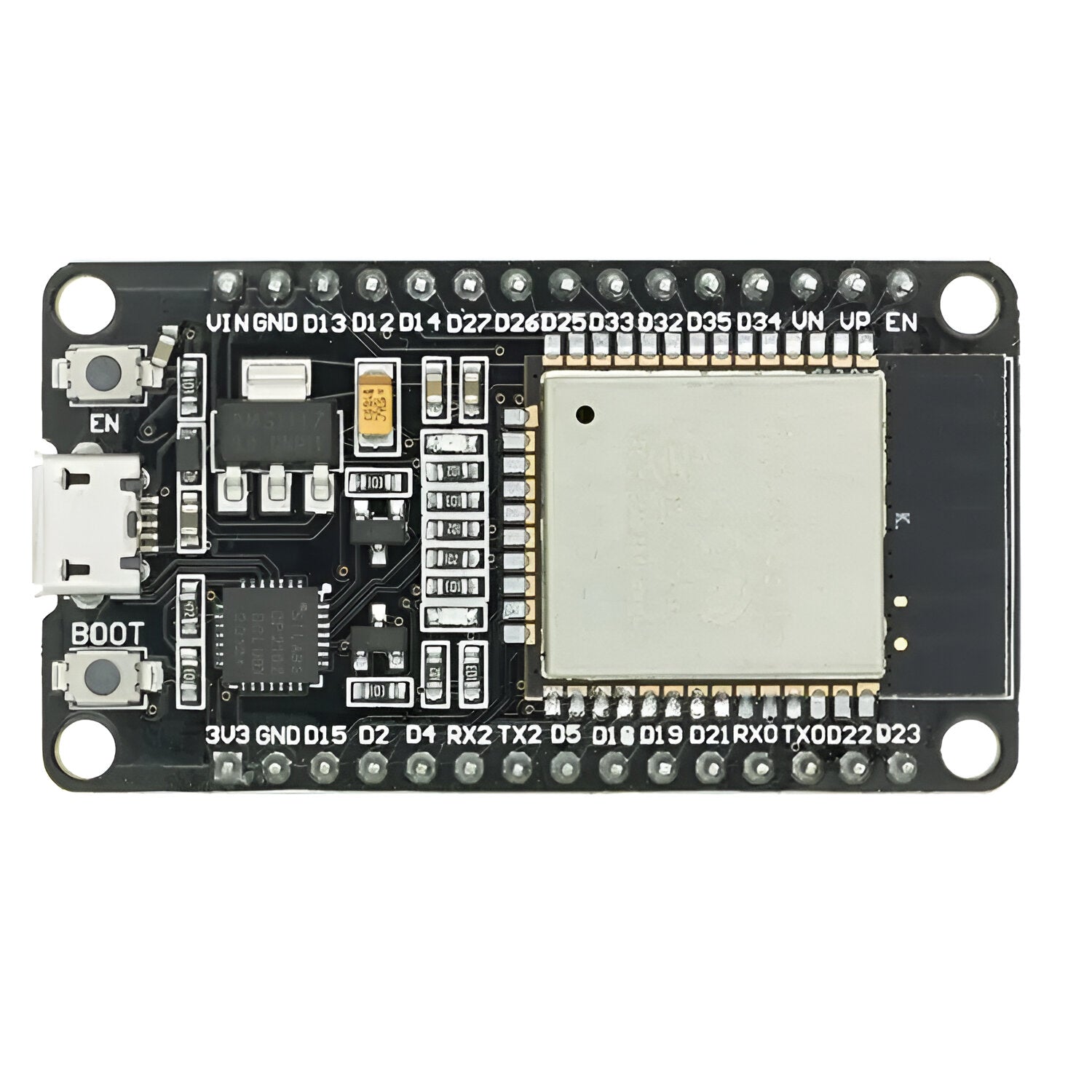 The ESP32 microcontroller is mounted to a breakout board with all the needed circuitry to power and program the chip and connect it to your computer. I has heaps of IO pins to connect peripherals, built-in power and control LEDs, an antenna for wi-fi signal, and other useful features. Thanks to the efforts of the Arduino community, is able to be programmed with the Arduino IDE 'langauge' through the ESP32 add-on. It has 512kB of RAM, 4MB of flash memory and features like 12 bit ADC, 8 bit DAC, I2S, I2C, touch sensor and SPI.