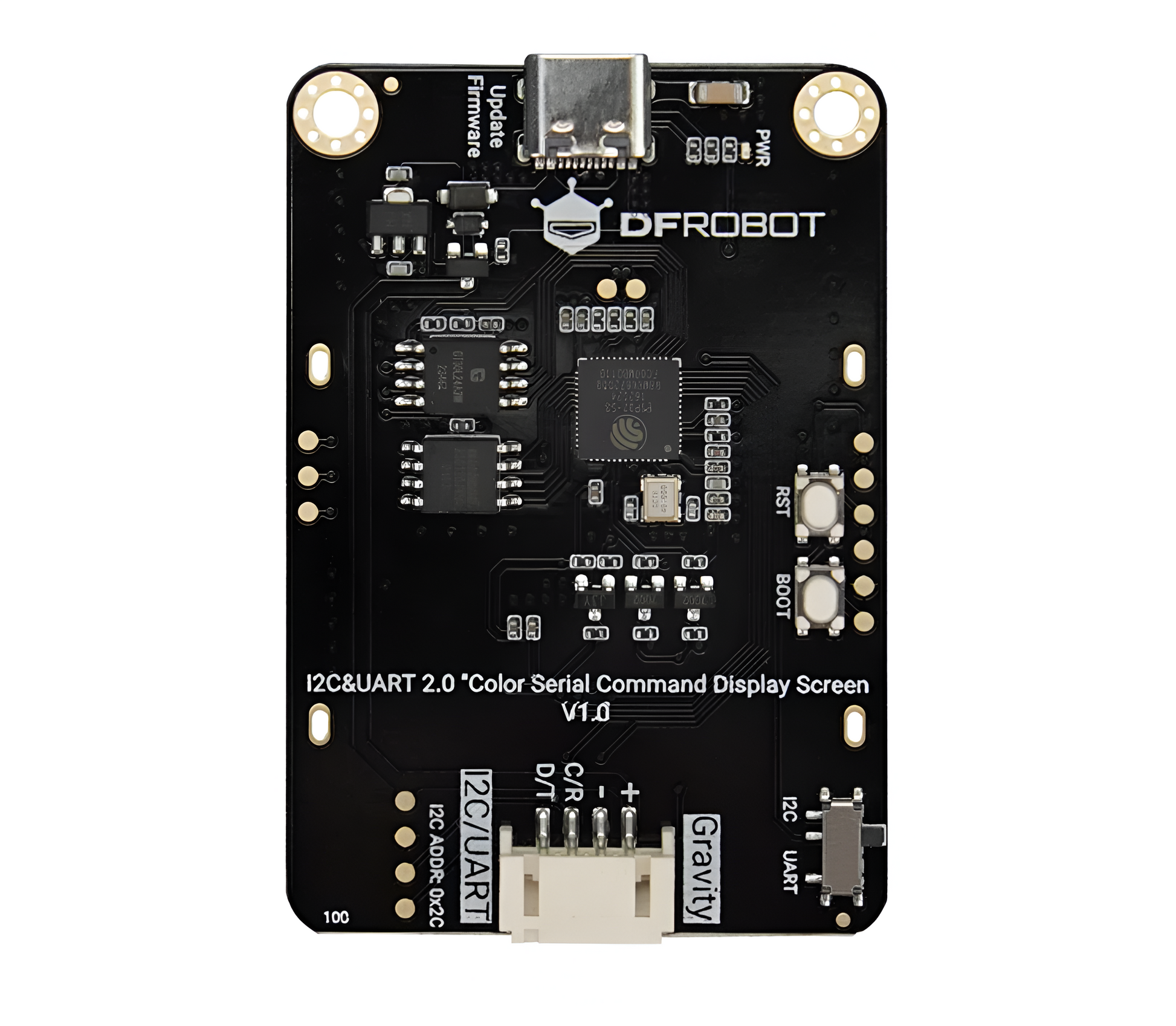 The 2.0" Color Serial Command Screen supports both I2C and UART communication interfaces, making it compatible with microcontrollers like Arduino (Arduino Uno, Arduino MEGA2560, Arduino Leonardo), FireBeetle ESP32, FireBeetle ESP8266, FireBeetle M0, micro:bit, and more. This flexibility ensures easy integration into a wide range of projects, enhancing the display capabilities of various microcontroller platforms.