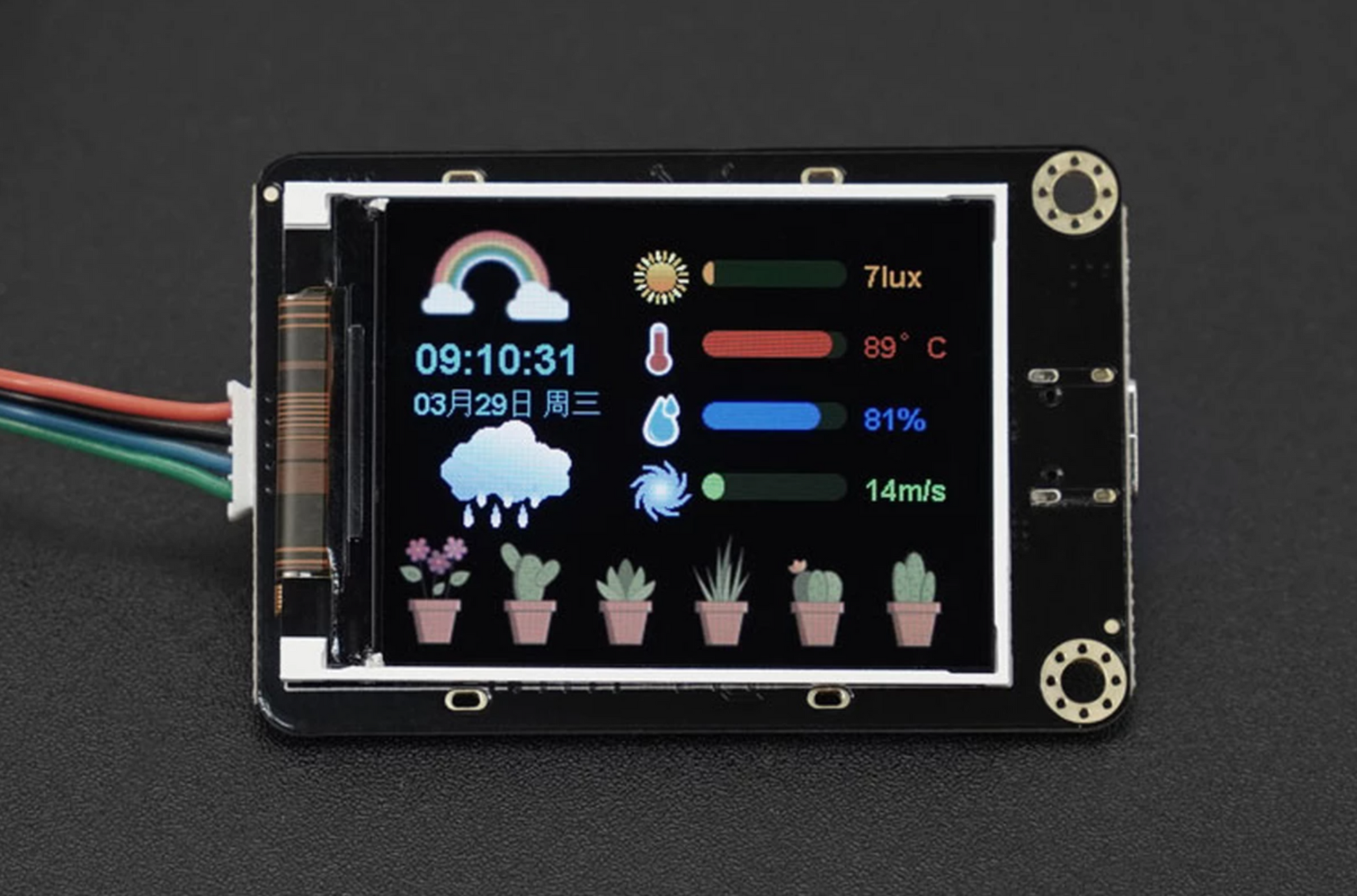 The 2.0" Color IPS Display Screen, which supports I2C and UART communication interfaces, is compatible with a variety of microcontrollers including Arduino, ESP32, and micro:bit. Equipped with a 320×240 resolution color display, this screen delivers sharp and vibrant images. It includes a vast collection of over 200 colorful icons, including high-definition PNG images and GIF animations, and dynamic widgets like progress bars, sliders, compasses, gauges, and charts. The screen is ideal for applications such as wearable devices, desktop weather stations, data visualization, and instrument and meter measurements. It offers high-quality visuals, dynamic interactions, and multilingual support, making it a versatile choice for diverse projects.